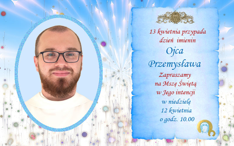 W poniedziałek 13 kwietnia swoje imieniny obchodzi o. Przemysław Pelikan. Msza św. w intencji solenizanta odbędzie się w niedzielę 12 kwietnia o godz. 1000 .Serdecznie zapraszamy!